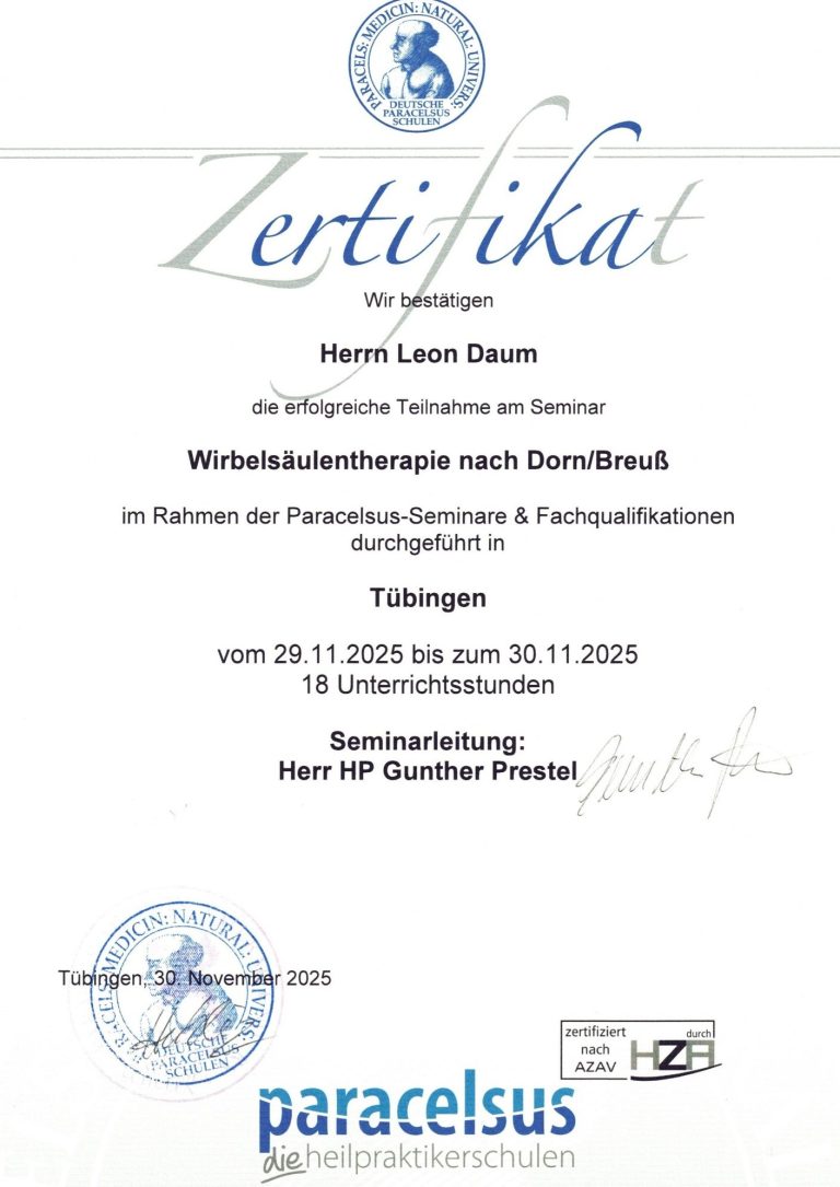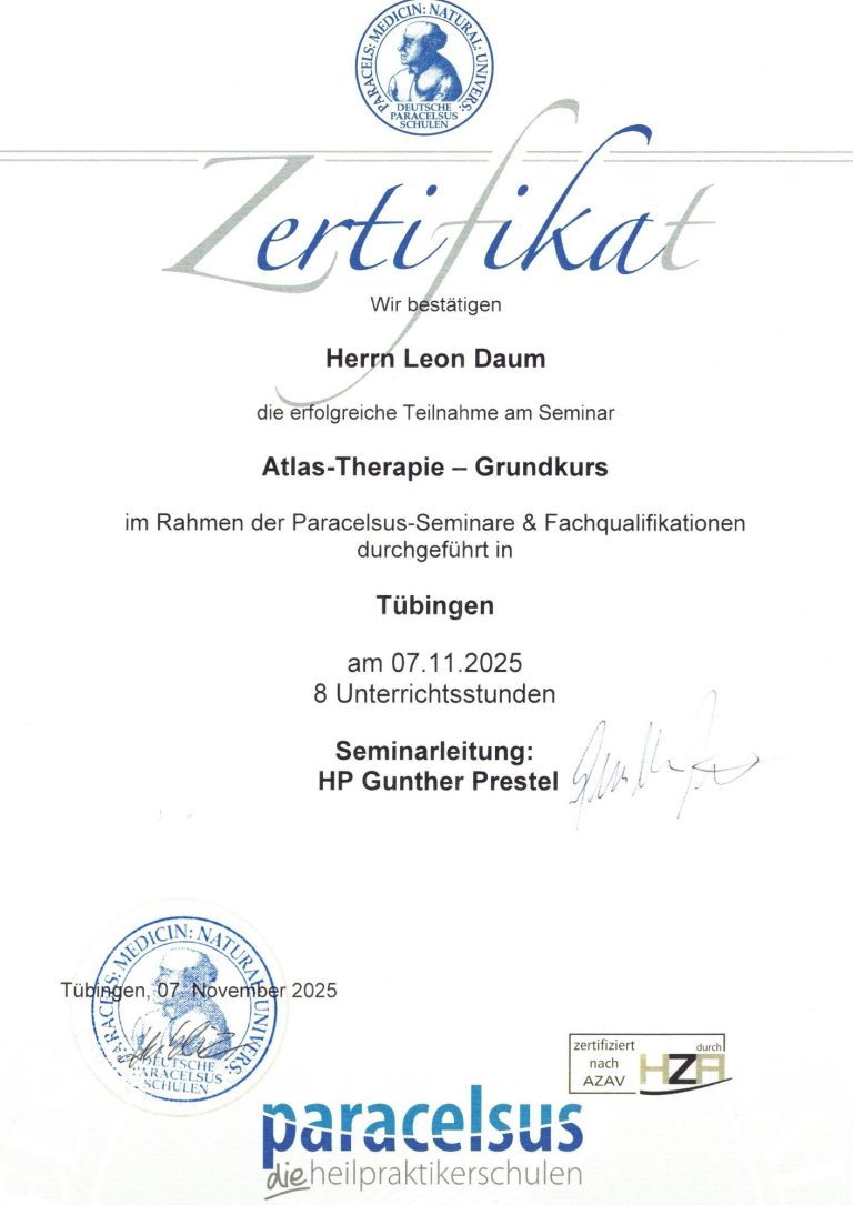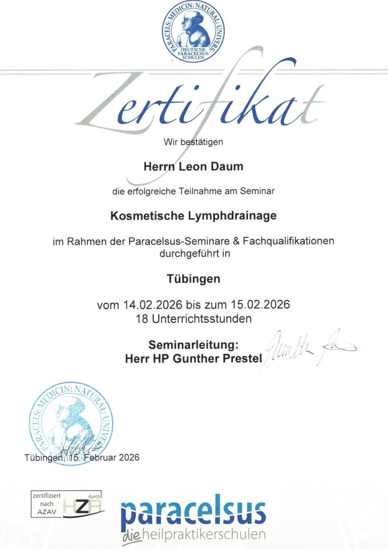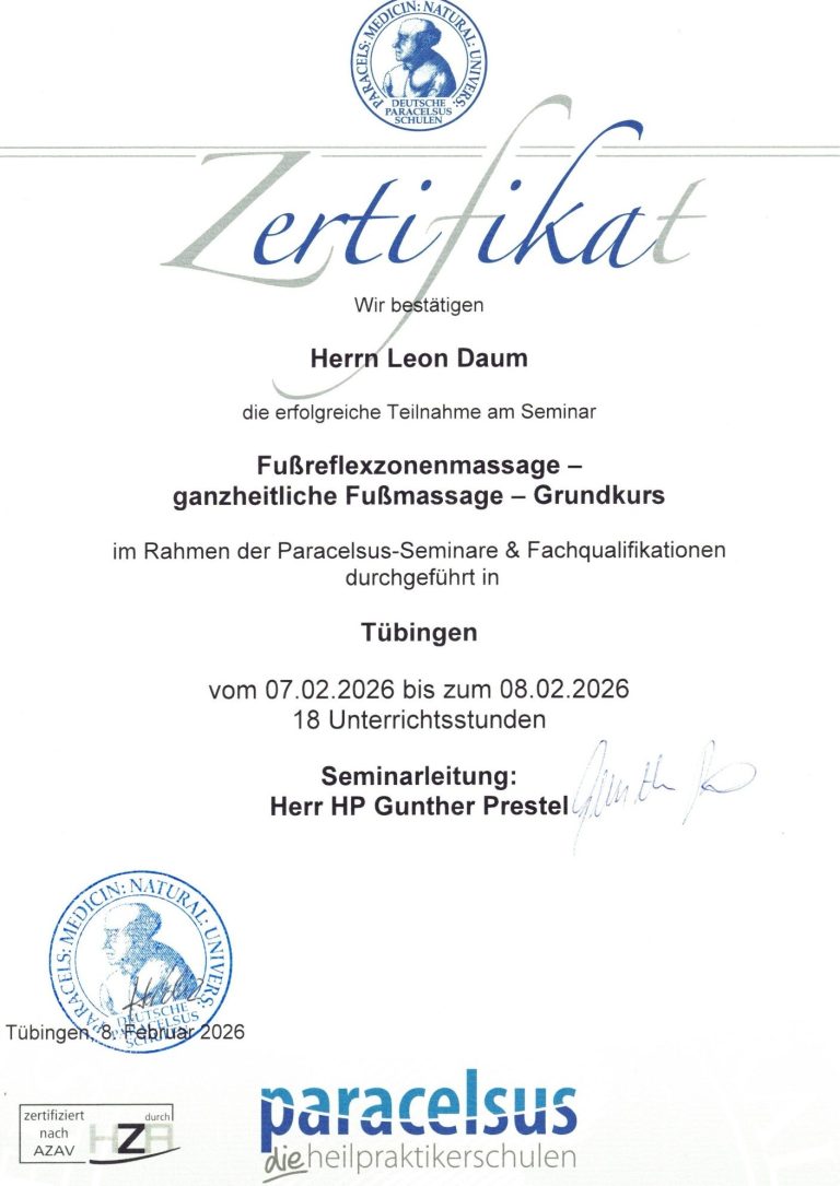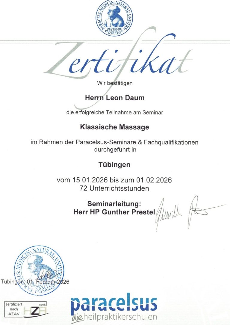 Mein Name ist Leon Daum und habe die Ausbildung zum geprüften ganzheitlichen Massagepraktier (WBG) abgeschlossen. Am 01.04.2026 eröffnete ich meine eigene Massagepraxis in der Kasierpassage in Reutlingen. Durch meine Ausbildung bei Paracelsus und der Mitgleidschaft im Wellnessverband konnte ich ein breites Portfolio an Massagen aufbauen. Eine Übersicht meiner erworbenen Fähigkeiten finden sie weiter unten.